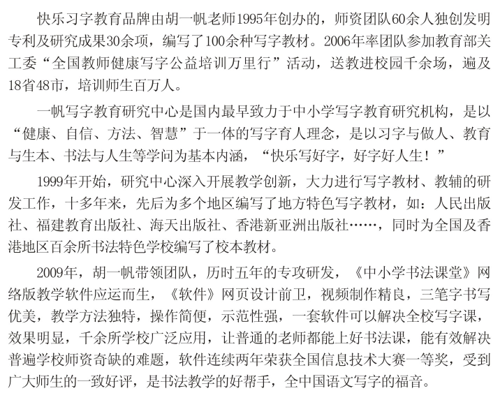 一个产品的成功诞生,背后必定有一支优秀的研发团队。《中小学书法课堂》写字软件的研发团队师资力量雄厚,软件开发及信息技术人才济济,其中专业的研究会成员兼一线书法教师达60余人,他们都是在深圳、香港、东莞及广州等地的书法特色学校从事专职书法教育工作的老师,具有丰富的书法教育工作经验和阅历。在软件开发方面,有资深软件工程师6人,视频拍摄及后期剪辑人员8人,测试运行人员5人,专业平面设计师、网页设计师、素材搜集及配音录入工作人员多达20多人,100多所书法特色学校参与测试运行。